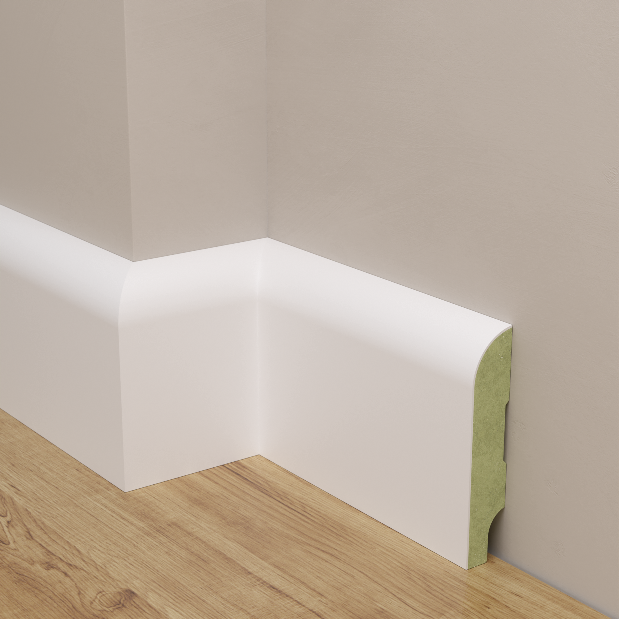 Najwyższej jakości listwa przypodłogowa produkowana na bazie wytrzymałej płyty drewnopochodnej MDF wilgocioodpornej zielonej o dużej gęstości od Polskich producentów. Powierzchnia listwy została 3-krotnie polakierowana twardym lakierem 2-składnikowym poliuretanowym, który spowalnia żółknięcie listew. Takie materiały powodują dużą odporność na uszkodzenia mechaniczne i zarysowania