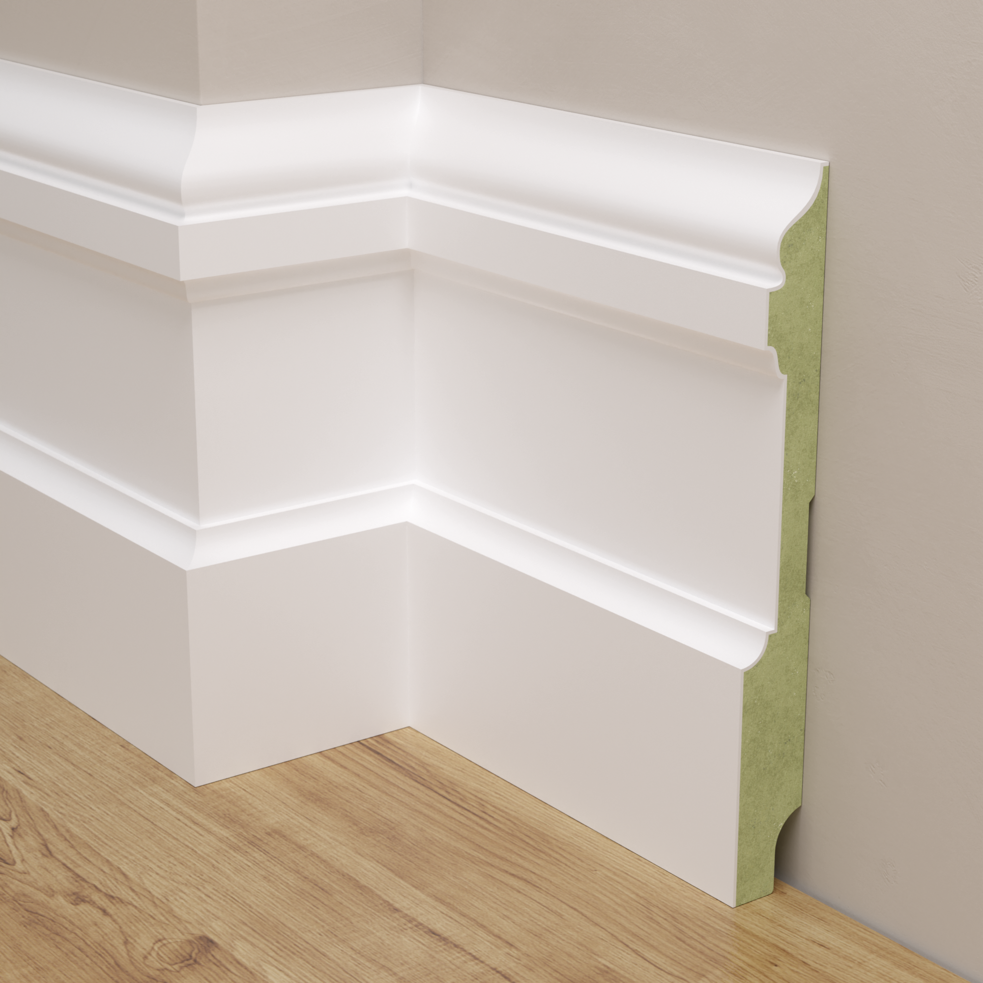 Najwyższej jakości listwa przypodłogowa produkowana na bazie wytrzymałej płyty drewnopochodnej MDF wilgocioodpornej zielonej o dużej gęstości od Polskich producentów. Powierzchnia listwy została 3-krotnie polakierowana twardym lakierem 2-składnikowym poliuretanowym, który spowalnia żółknięcie listew. Takie materiały powodują dużą odporność na uszkodzenia mechaniczne i zarysowania
