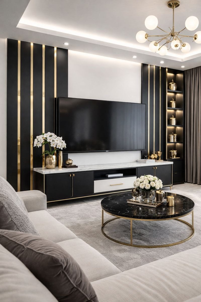 kontrastowe połączenie czerni z lustrzanym złotem,
