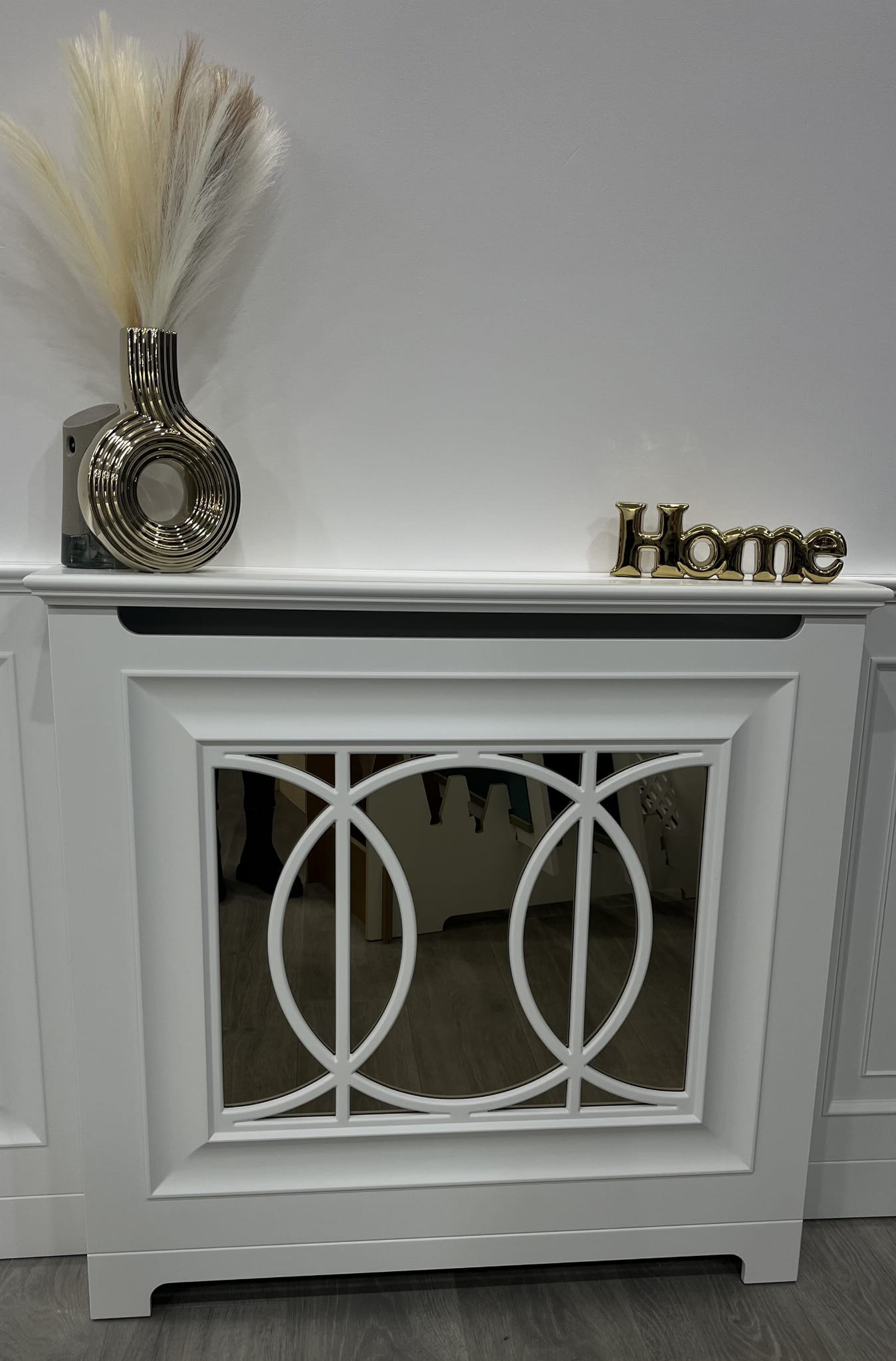 Elegancka zabudowa kaloryfera z półką łączy funkcję dekoracyjną i praktyczną. Starannie zaprojektowany front z geometrycznym motywem ukrywa grzejnik i poprawia estetykę pomieszczenia. Zabudowa wykonana jest z solidnej płyty MDF z lustrem i lakierowana w kolorze RAL 9003.