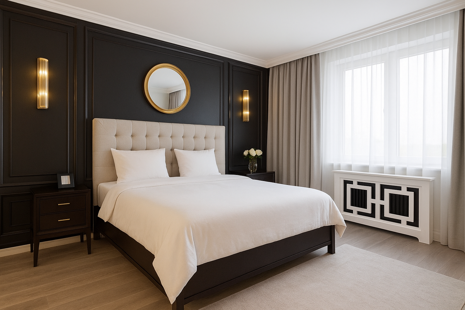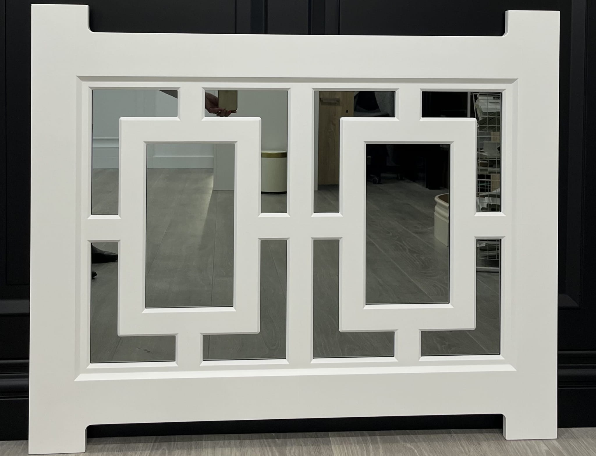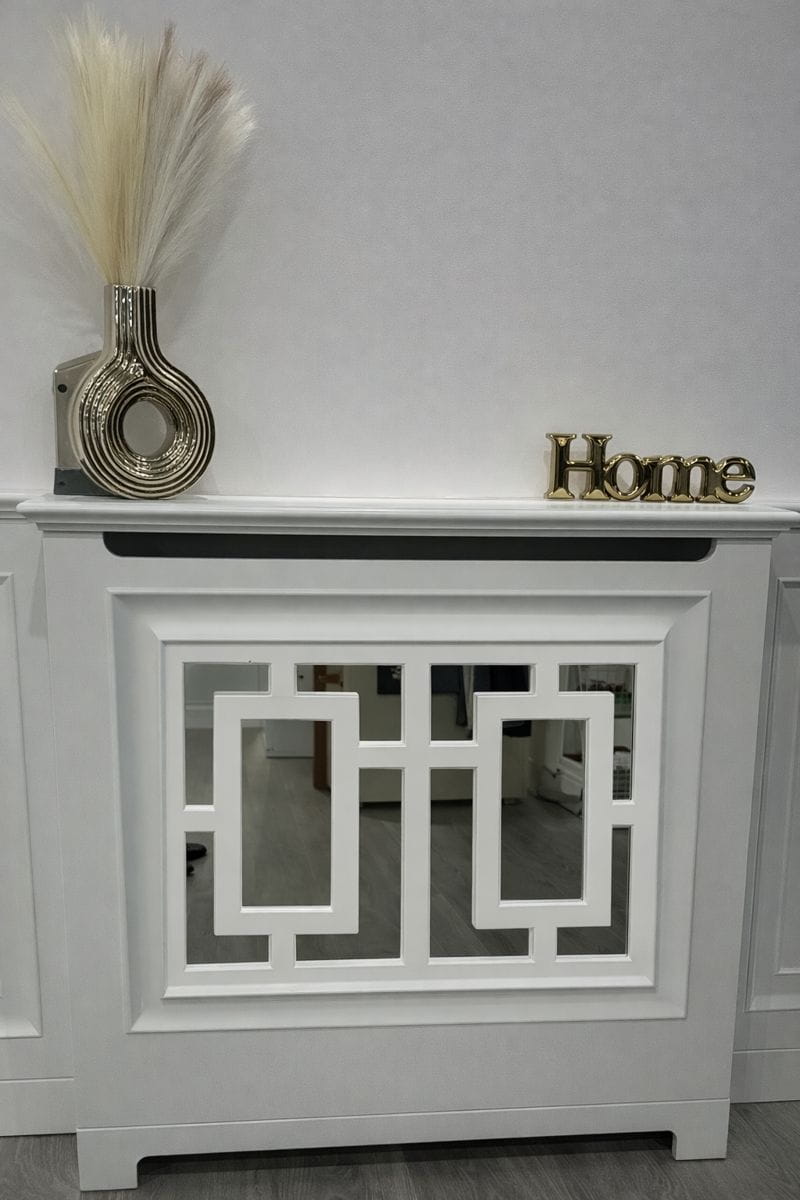 Elegancka zabudowa kaloryfera z półką łączy funkcję dekoracyjną i praktyczną. Starannie zaprojektowany front z geometrycznym motywem ukrywa grzejnik i poprawia estetykę pomieszczenia. Zabudowa wykonana jest z solidnej płyty MDF z lustrem i lakierowana w kolorze RAL 9003.