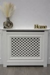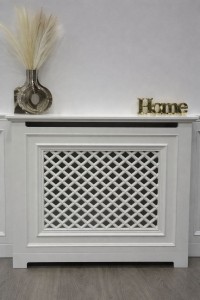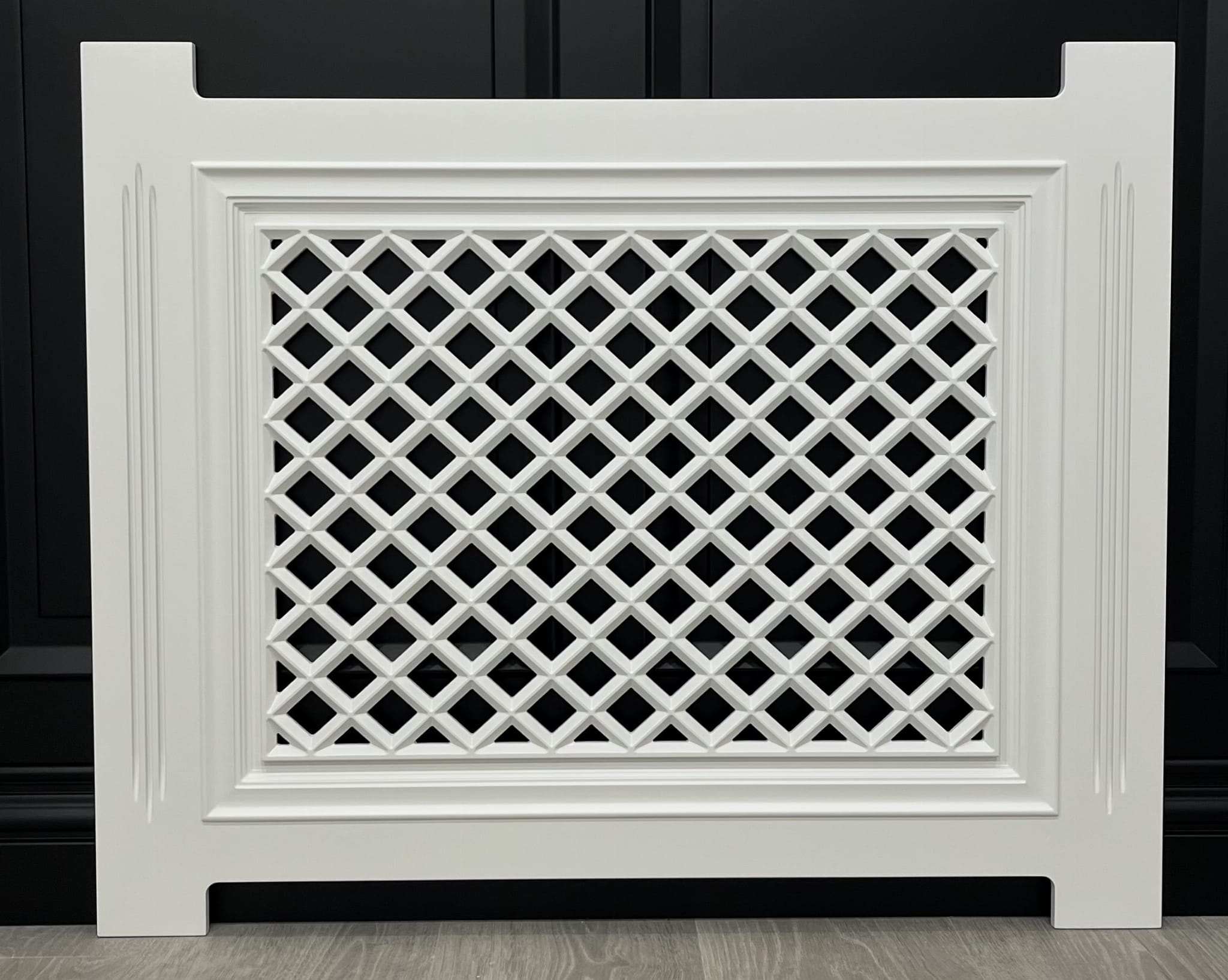 Elegancka zabudowa kaloryfera z półką łączy funkcję dekoracyjną i praktyczną. Starannie zaprojektowany front z geometrycznym motywem ukrywa grzejnik i poprawia estetykę pomieszczenia. Zabudowa wykonana jest z solidnej płyty MDF z lustrem i lakierowana w kolorze RAL 9003.